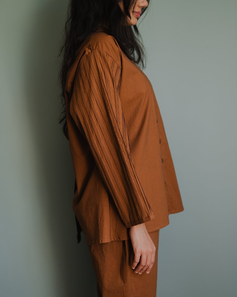 Made in organic cotton our arctic shirt has mandarin collar and front buttonhole opening. It has full sleeves with pin tuck details and back of the shirt has shoulder panel with overlapping style. It is paired with arctic straight pants having pockets.
