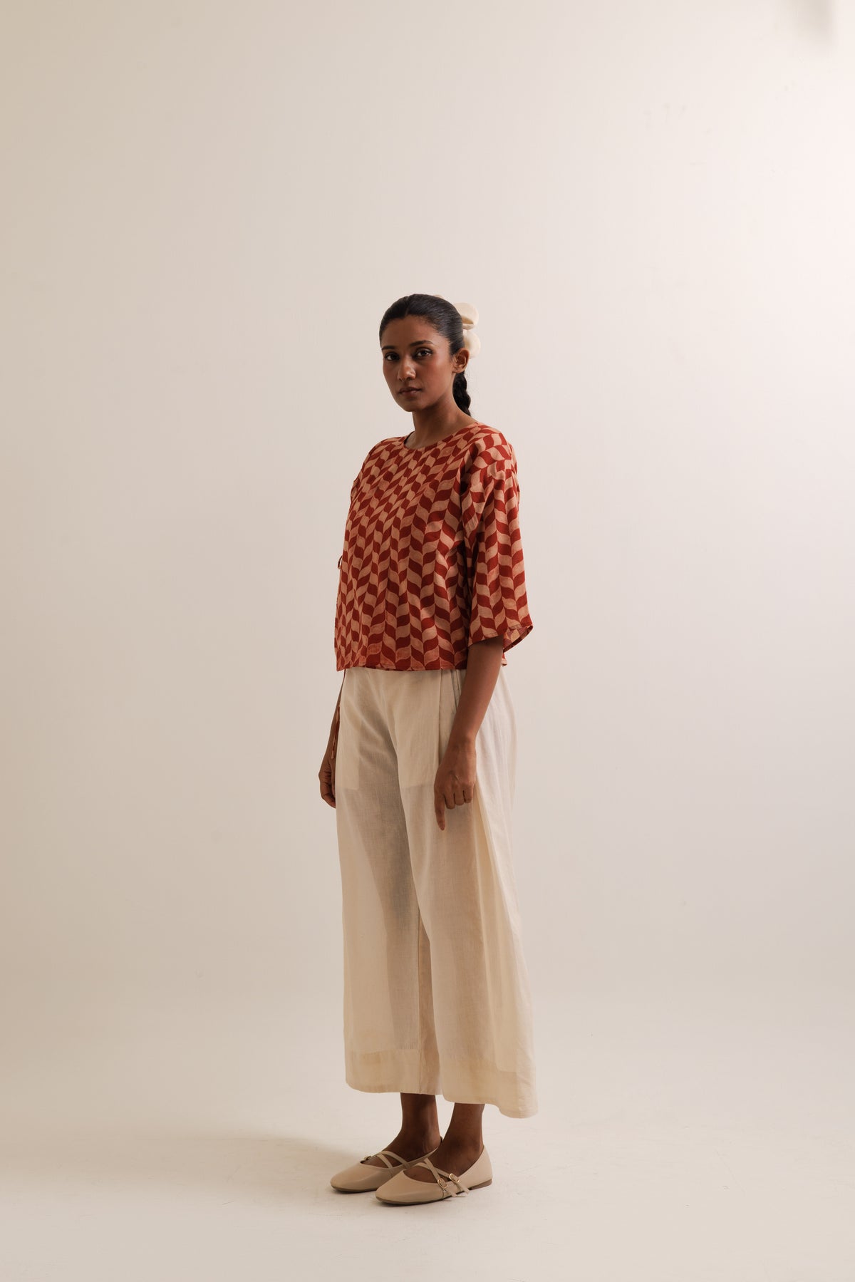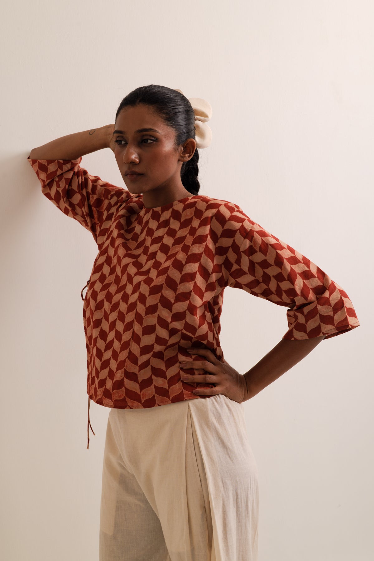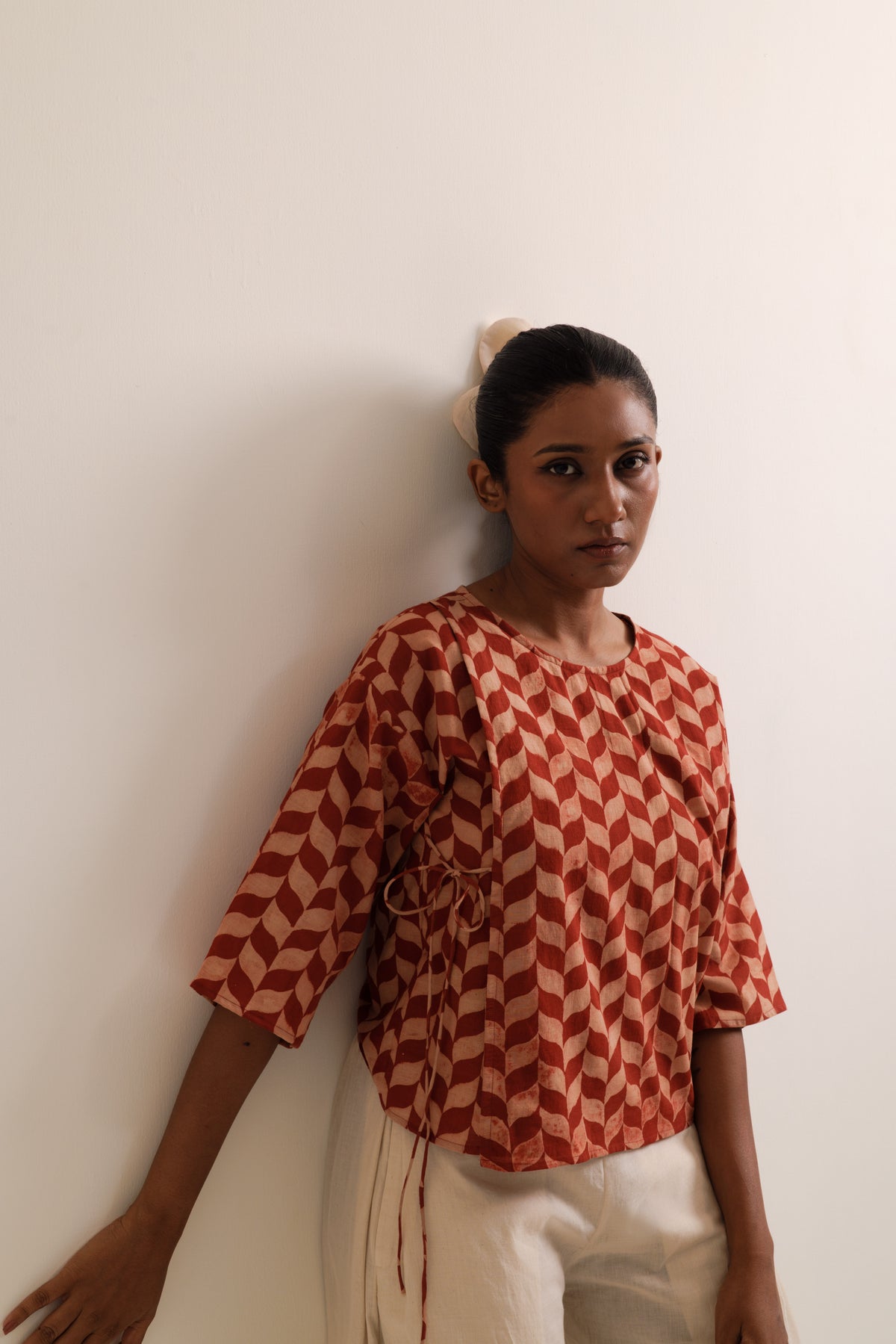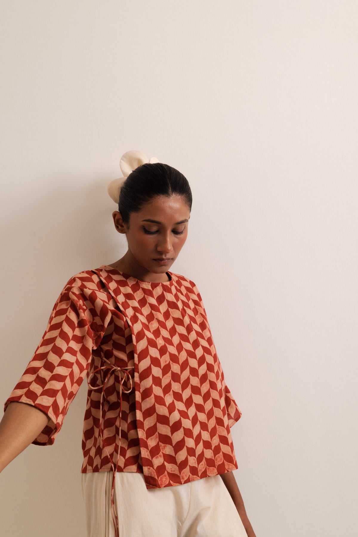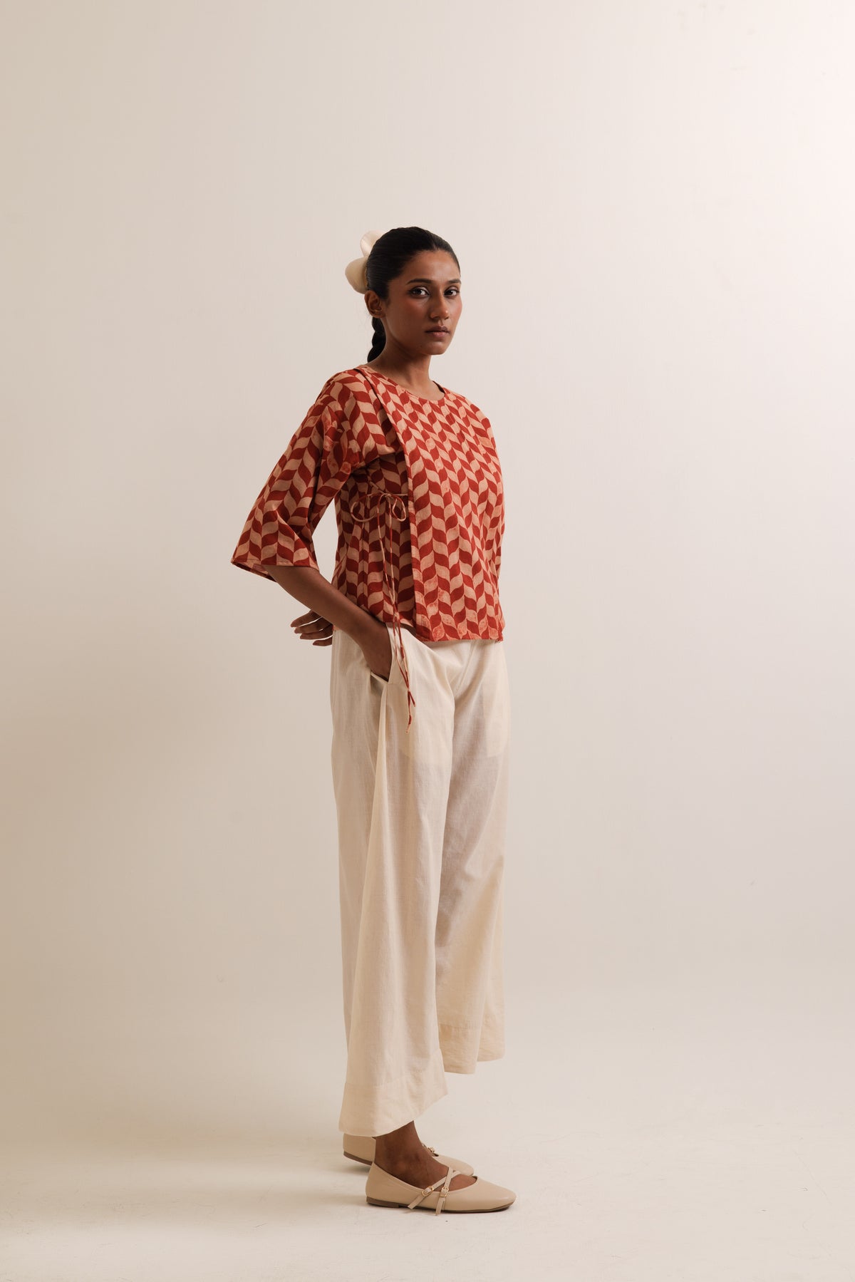 Fern top & trousers set made in handwoven bengal cotton. Top is hand-block printed, has front tie-up opening. It is paired with straight fit, wide leg trousers featuring box pleat on the sides and pockets