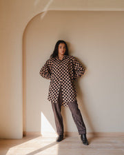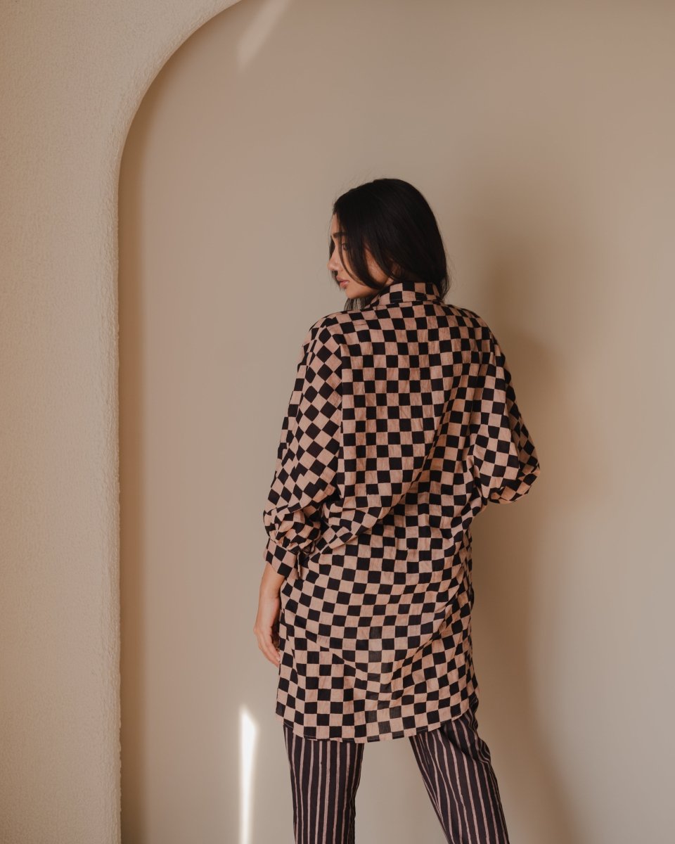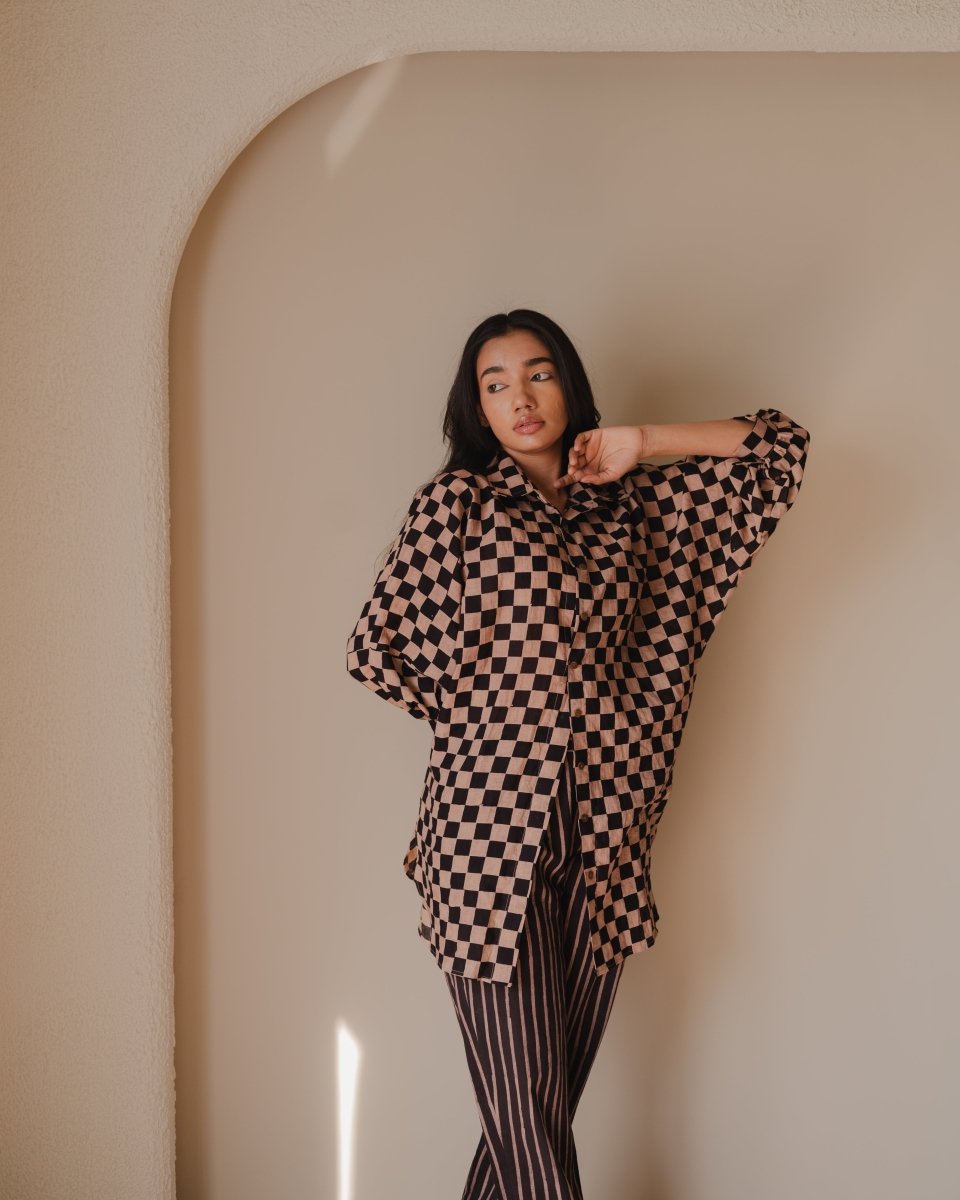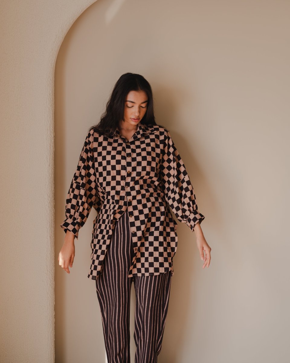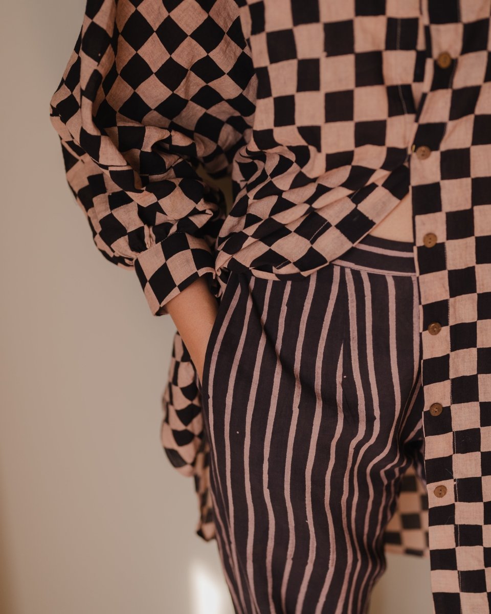 Tramp trousers and shirt set made in hand-spun cotton and block printed in natural colours. Shirt comes with a free size silhouette, collar neckline, front button opening, gathering of fabric on cuff line and full sleeves. Trousers are straight fit and comes with pockets.