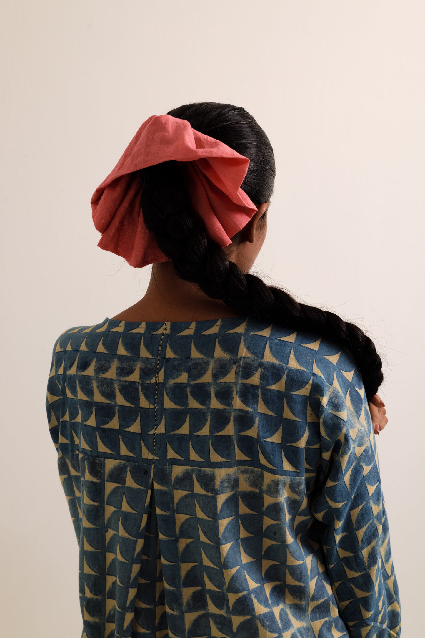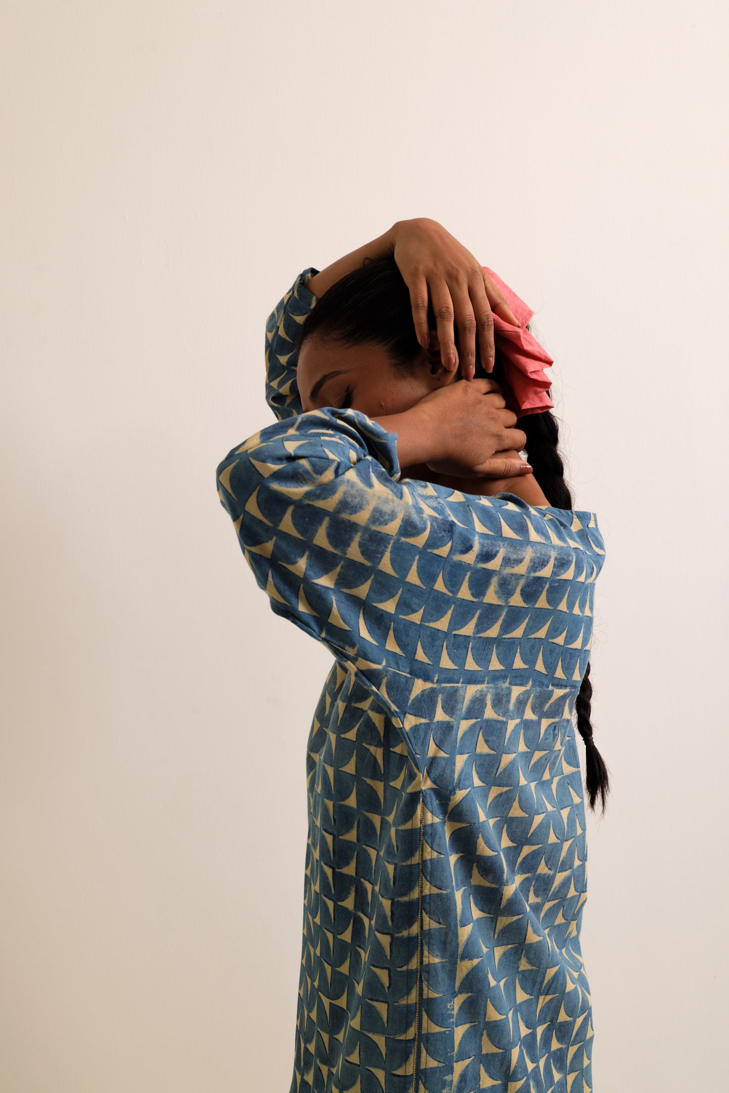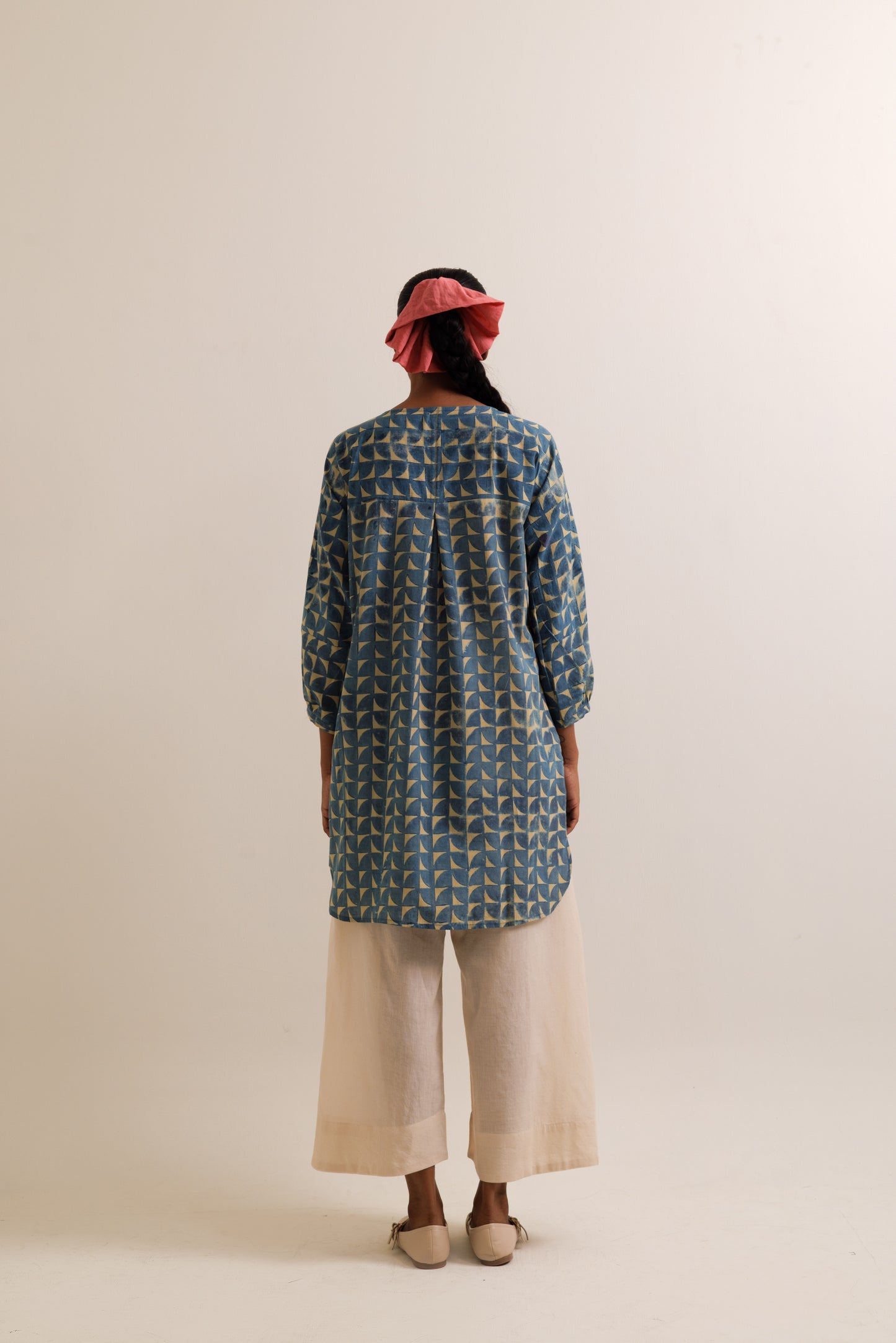 Luna kurta set made in handwoven bengal cotton, kurta featuring a front centre button placket and hand-block printed. Trousers are straight fitted with wide hemline and pockets, both finished with fagoting side seamlines.