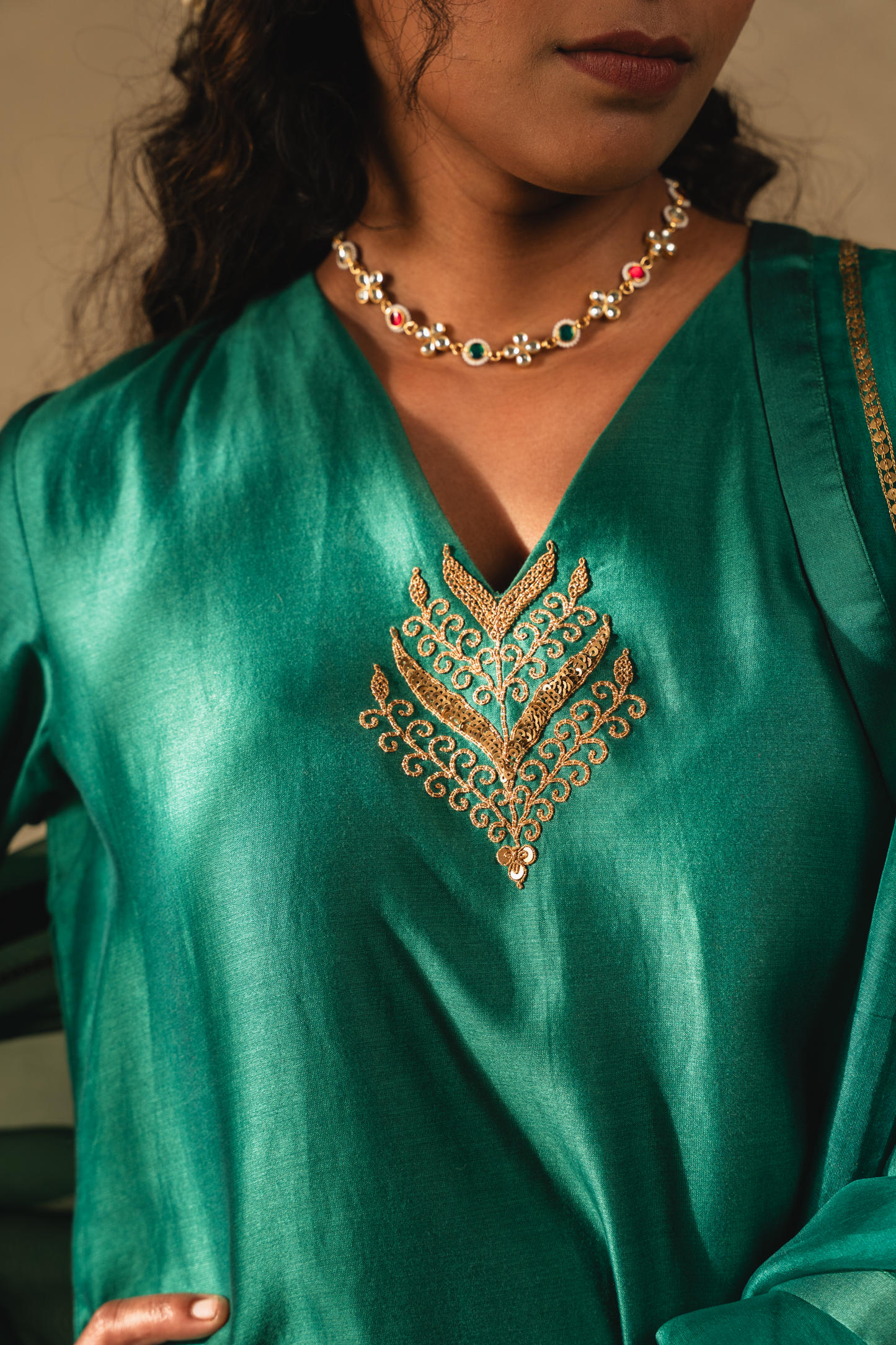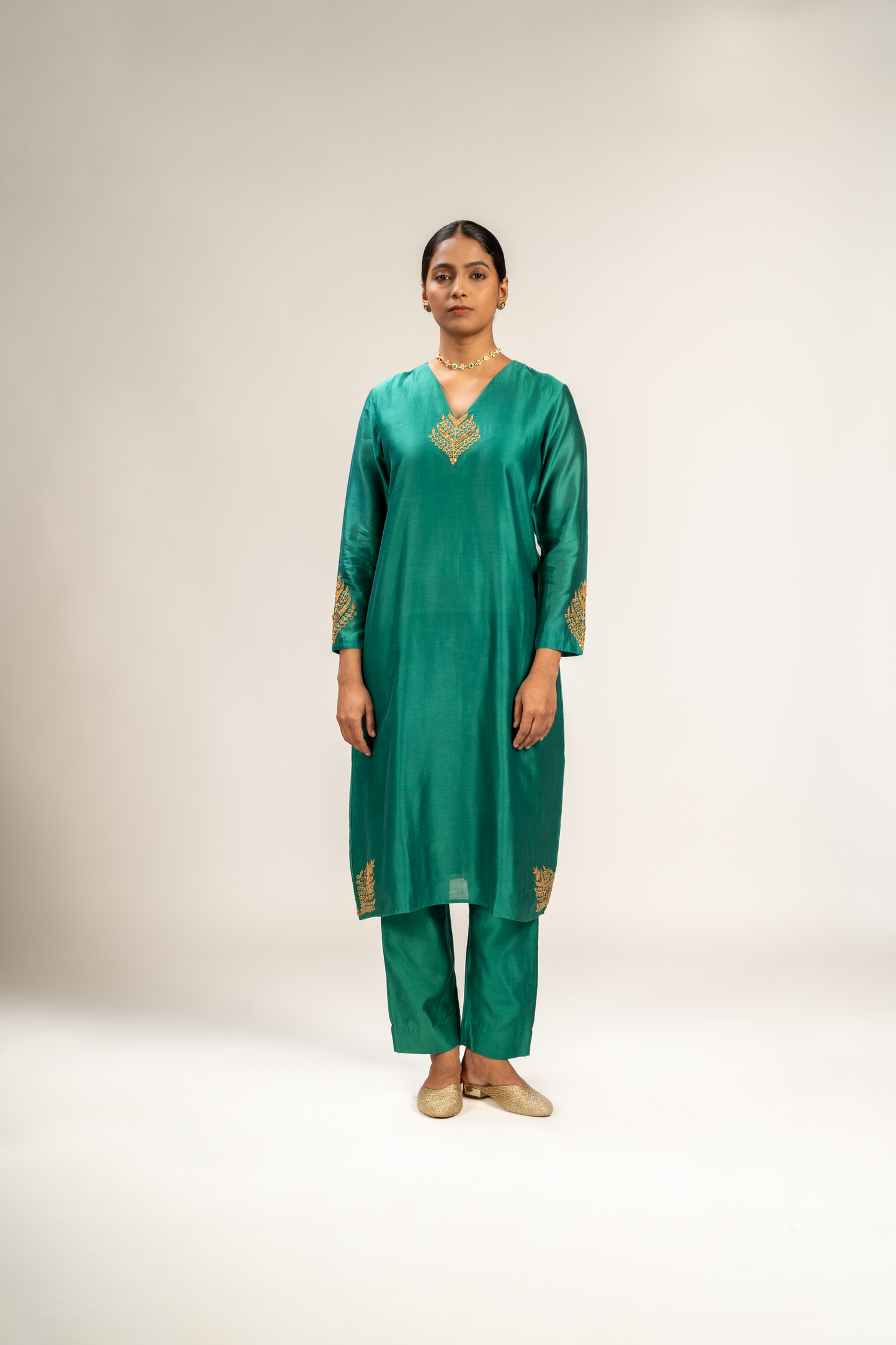 Regular price Rs. 37,100.00The set features an A-line kurta, trousers and dupatta. Kurta and trousers are made in handwoven chanderi. Kurta features intricately woven marodi floral motifs. Trousers are narrow straight fit with side pockets. Dupatta is made in organza silk projecting metal sequins embroidered border on the hems with marodi small motifs on the edges.