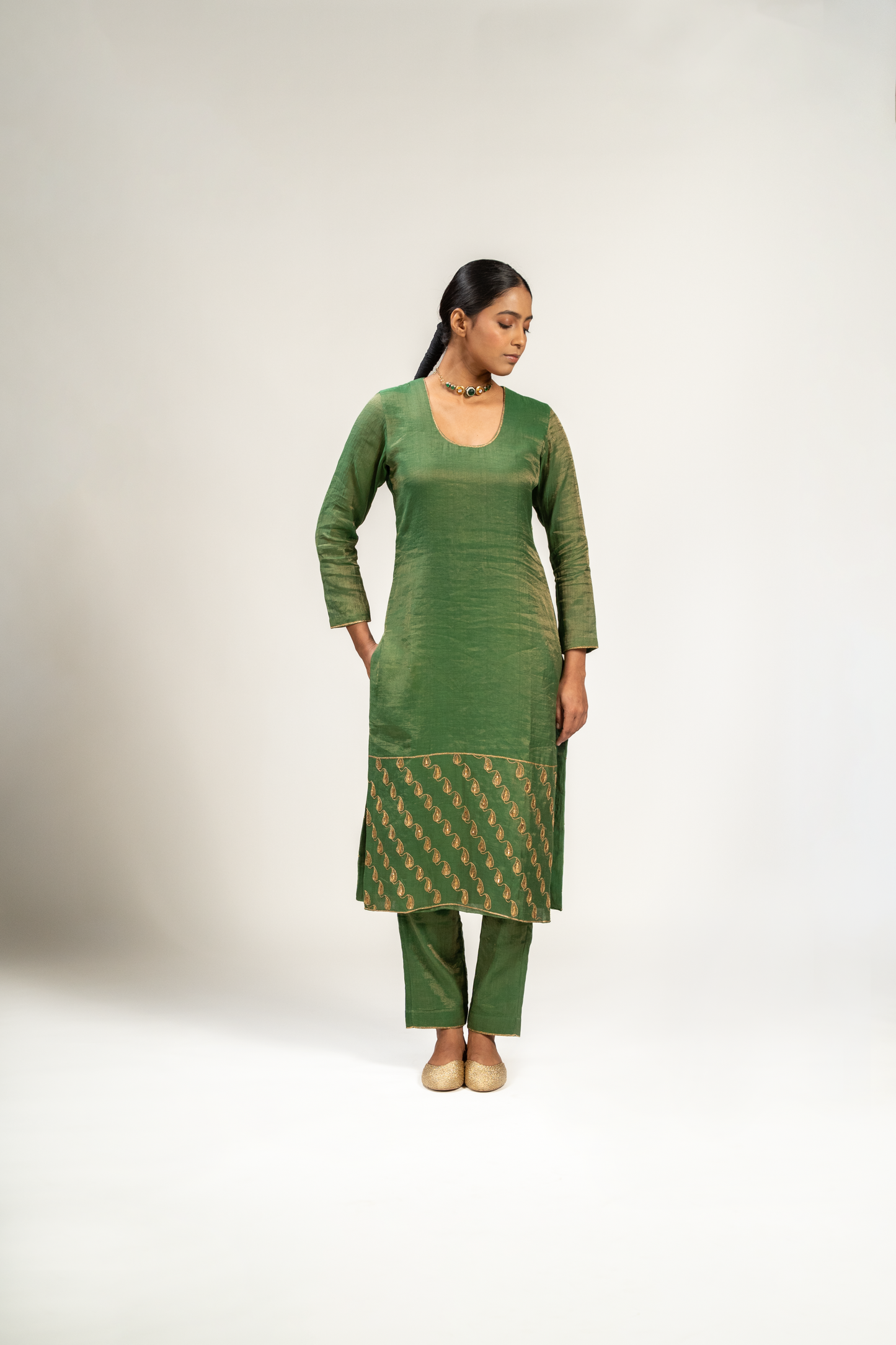 Regular price Rs. 38,500.00This set features a kurta, trousers and dupatta made in handwoven zari chanderi. Kurta is a straight fit, has a deep U-round neckline featuring kasab and sequins aari embroidered paisley motifs on the hem. Trousers are straight fit with side pockets. Dupatta features all over paisely and a metal gota border.