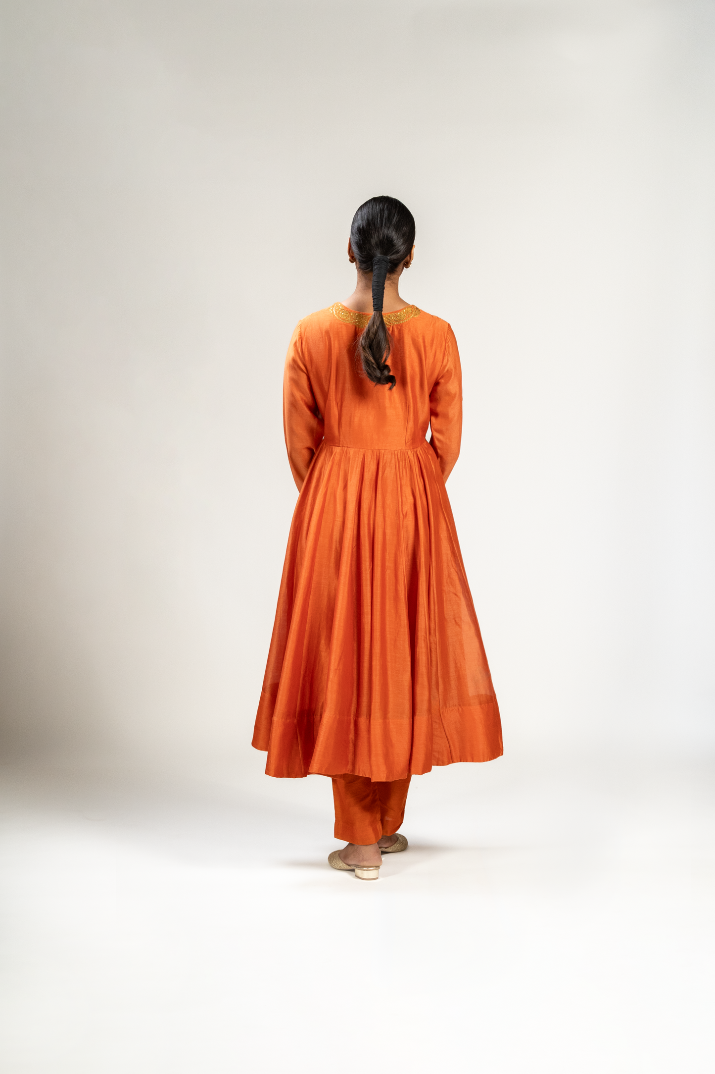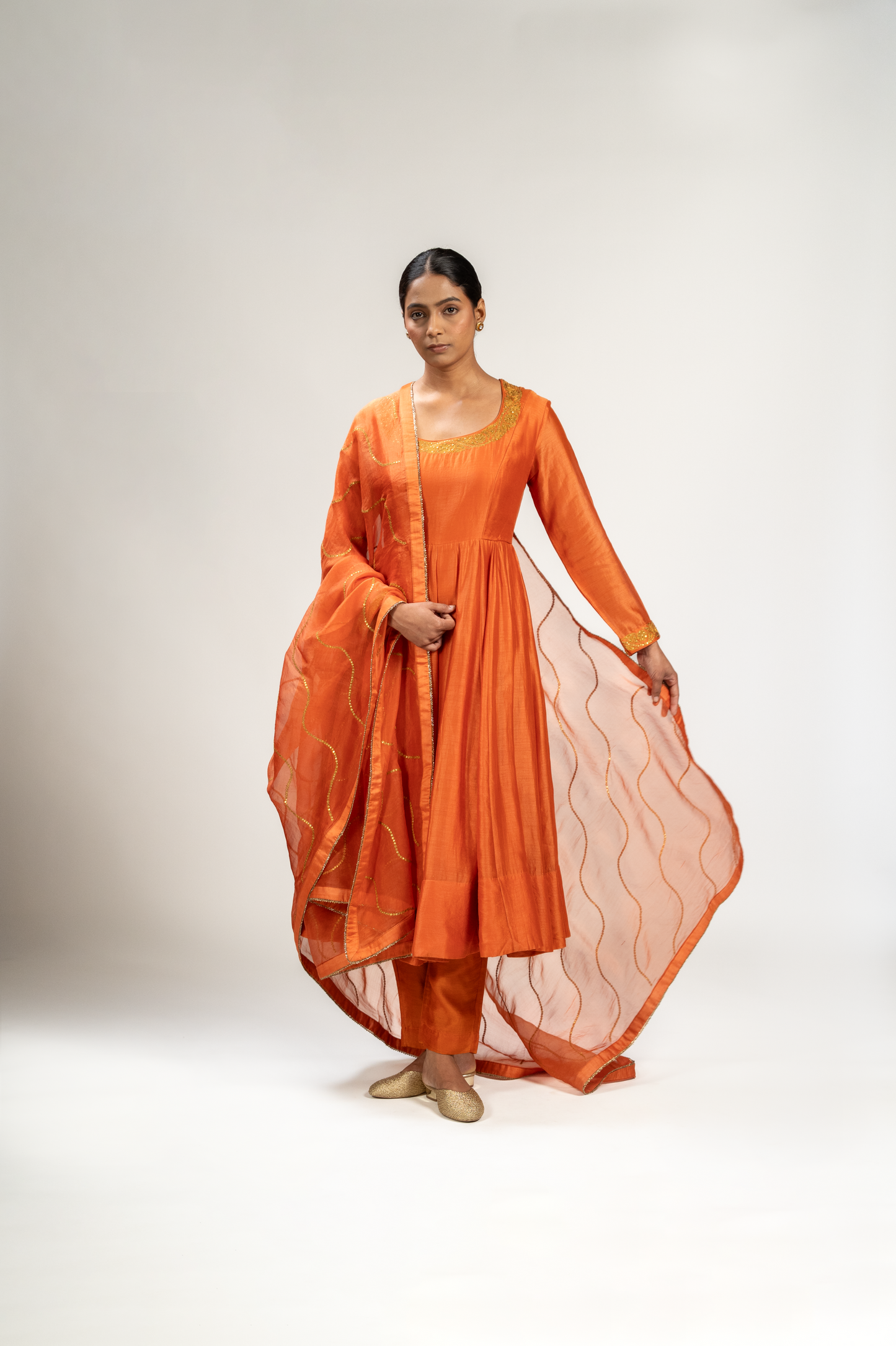 Anarkali set made in handwoven chanderi featuring kali's on the waistline, full sleeves and a deep round neckline paired with chanderi silk pants. The neckline and sleeves features a traditional double kasab and metal coins floral border. It is paired with an organza silk dupatta projecting embroidered curvilinear lines.