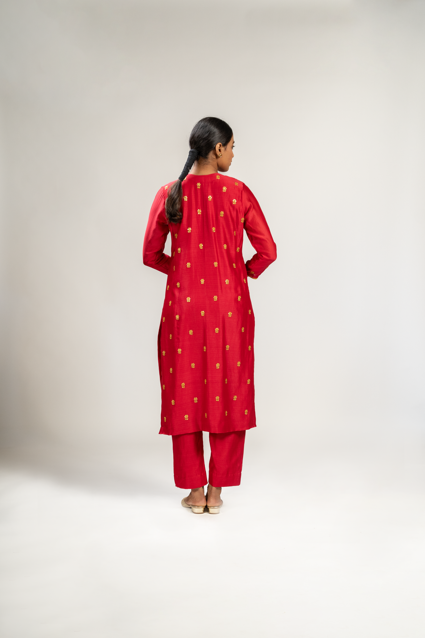 feature a kurta, trousers and dupatta made in handwoven chanderi. Kurta has a straight fit, V neckline and features all over marodi floral motifs. Trousers are straight fit with side pockets. Dupatta is made in organza silk projecting a metal gota lace.