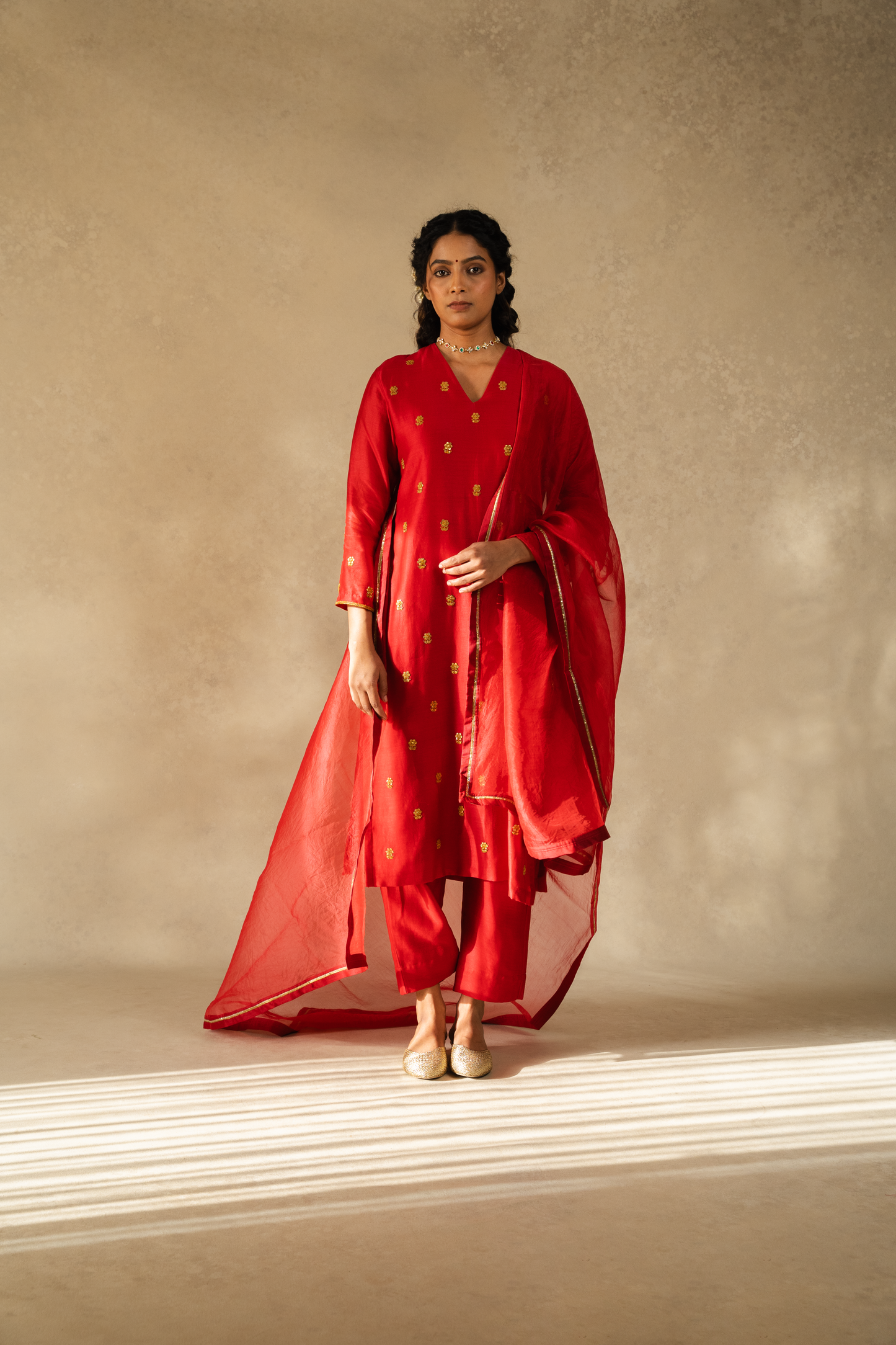 Regular price Rs. 32,550.00feature a kurta, trousers and dupatta made in handwoven chanderi. Kurta has a straight fit, V neckline and features all over marodi floral motifs. Trousers are straight fit with side pockets. Dupatta is made in organza silk projecting a metal gota lace.