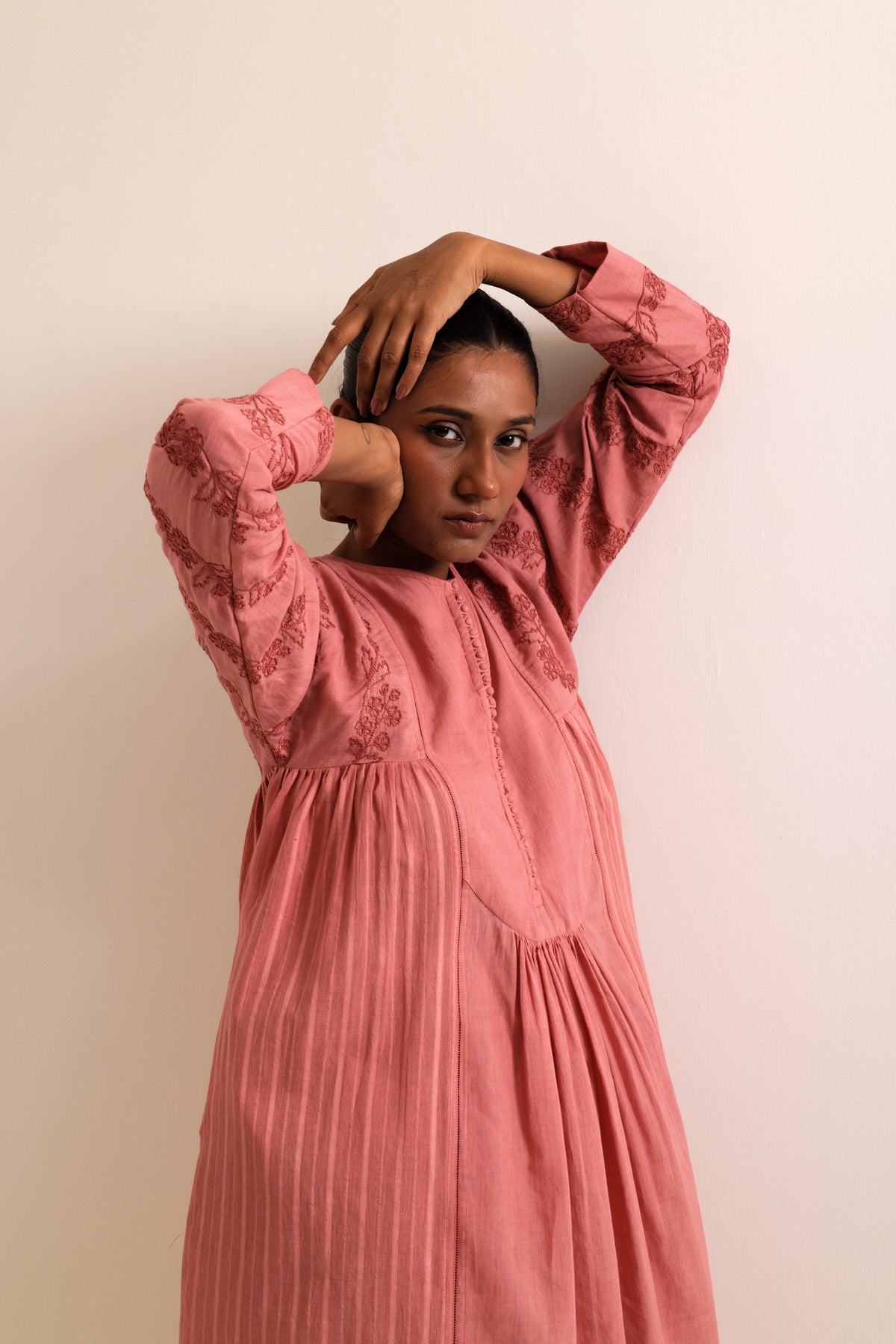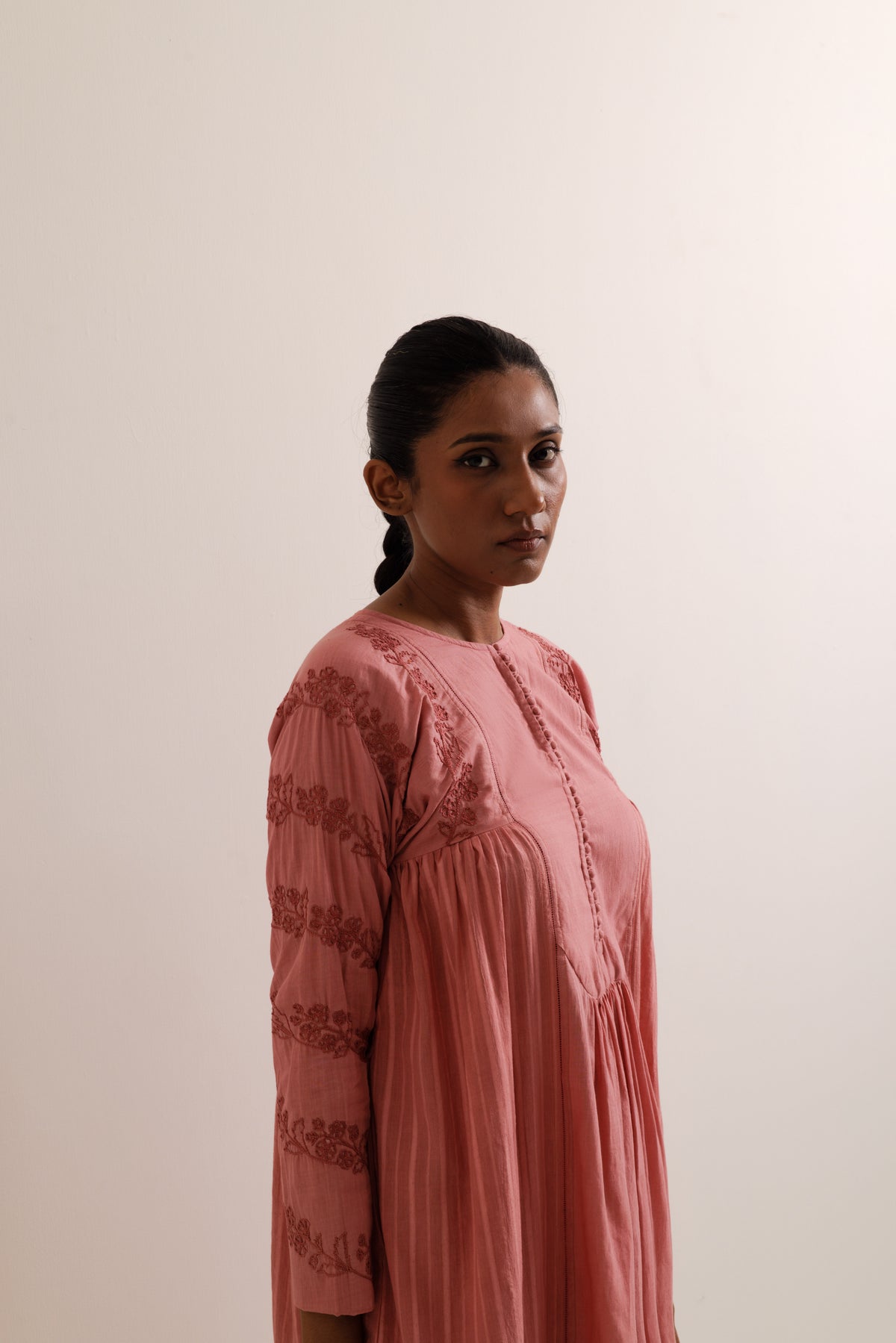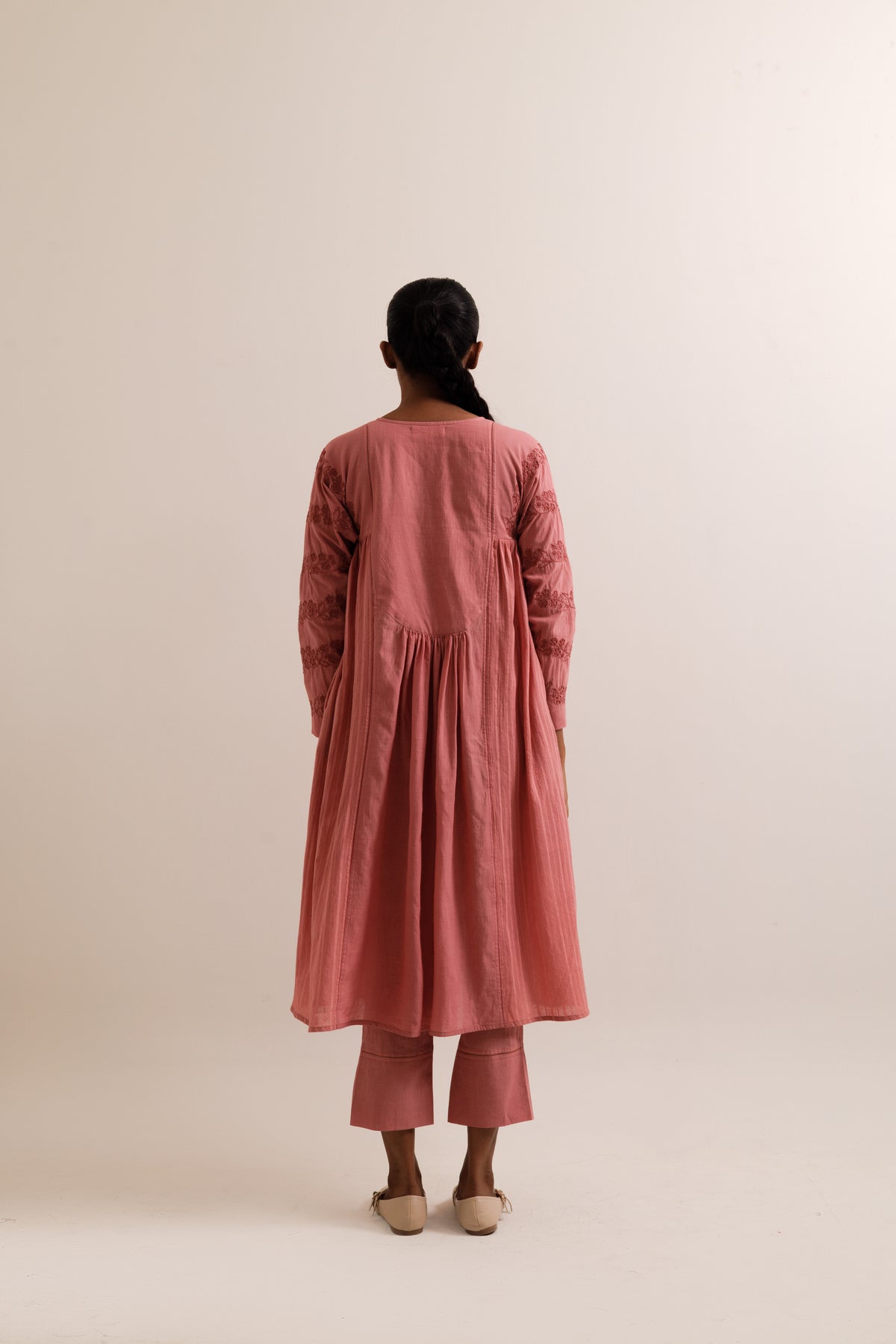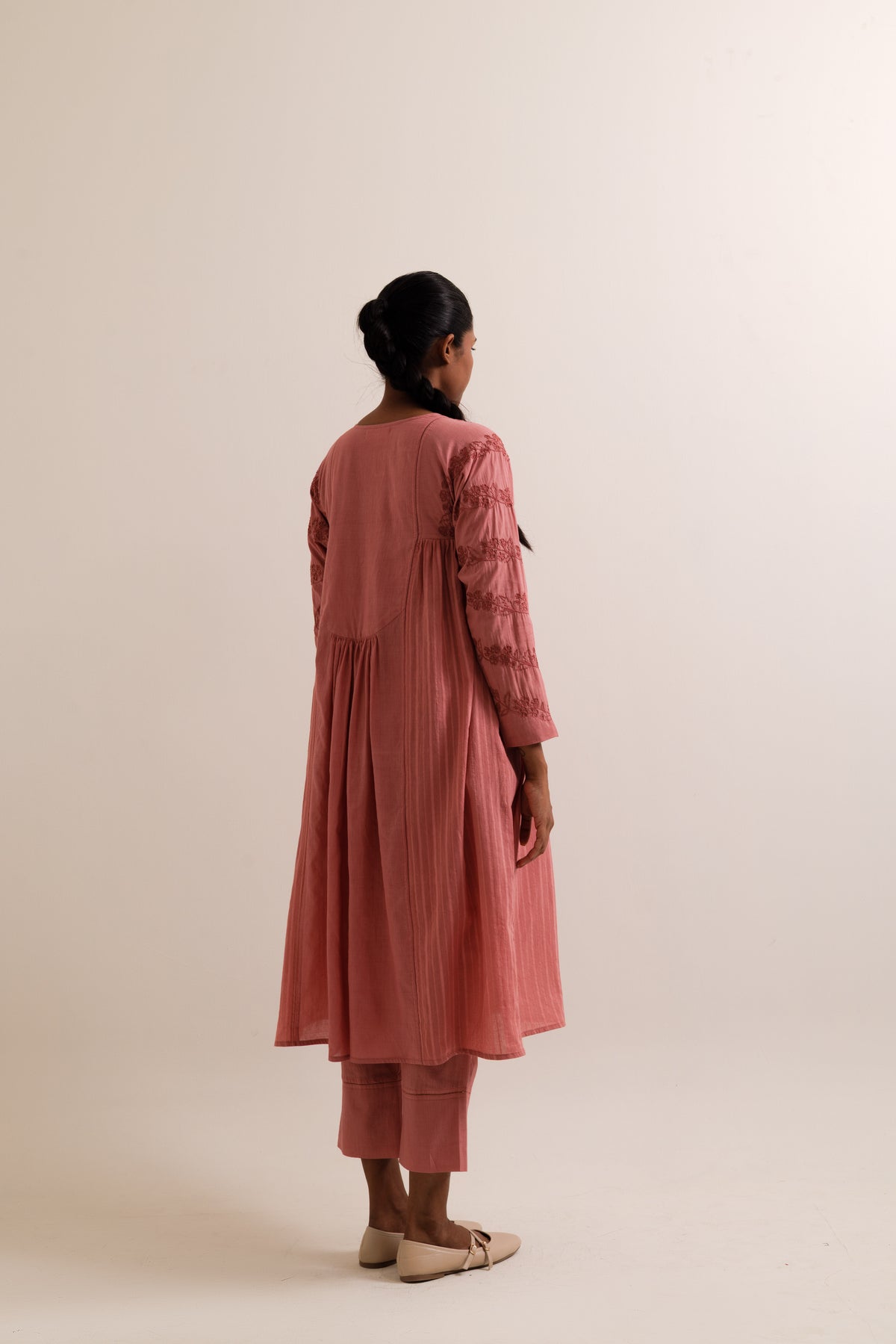 Aharya kurta set made in handwoven bengal cotton. Kurta is panelled and combined together with fagoting seam lines featuring hand embroidery inspired by cherry blossom. Kurta feautures a patched yoke with light gathers front button opening and pockets on both sides, paired with straight fit trousers.