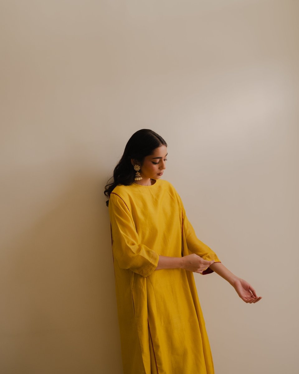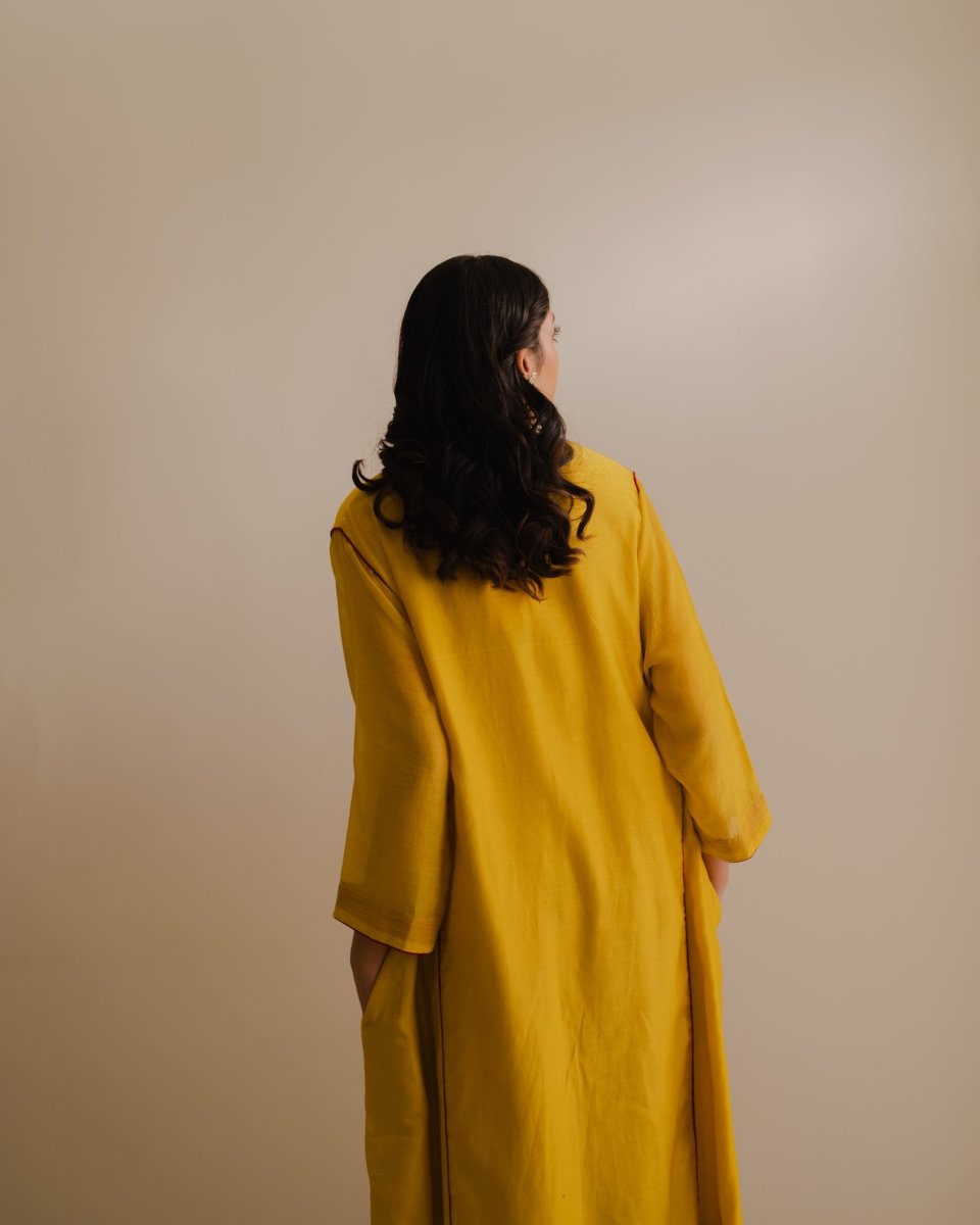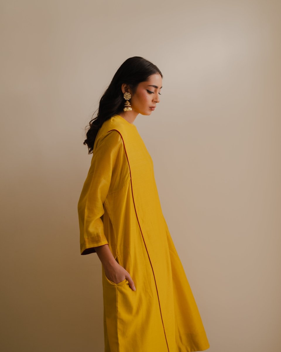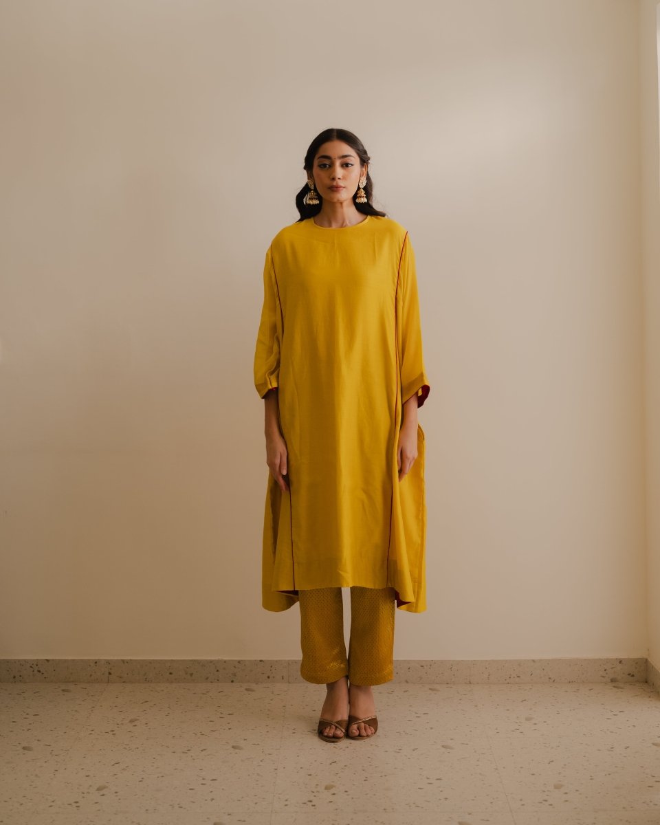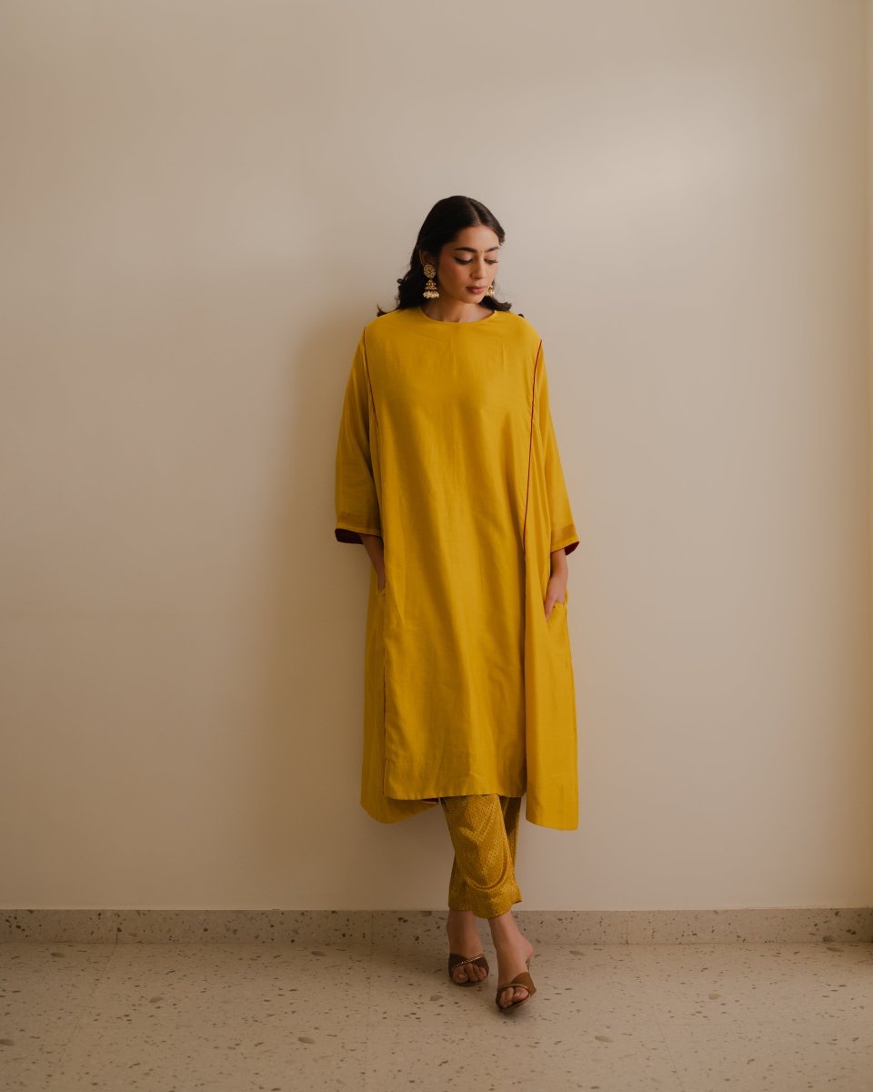 Akhil abha is made in chanderi silk with round neckline and contrasting piping details. Kurta has back loop button opening and pockets. It is paired with contrast colour embroidered details gajji silk straight trousers.