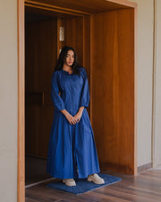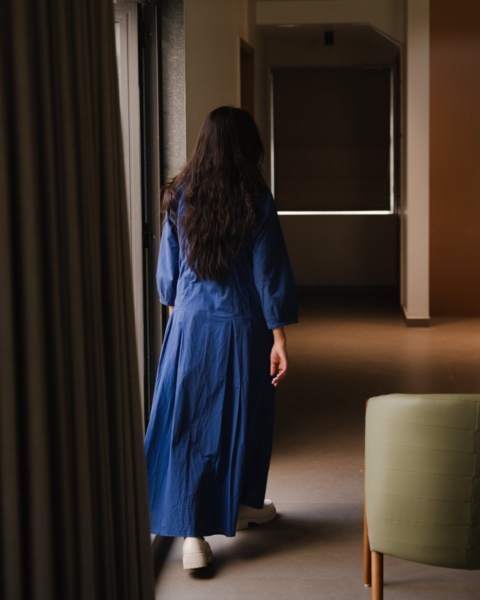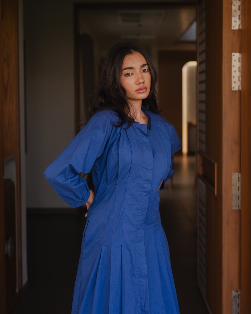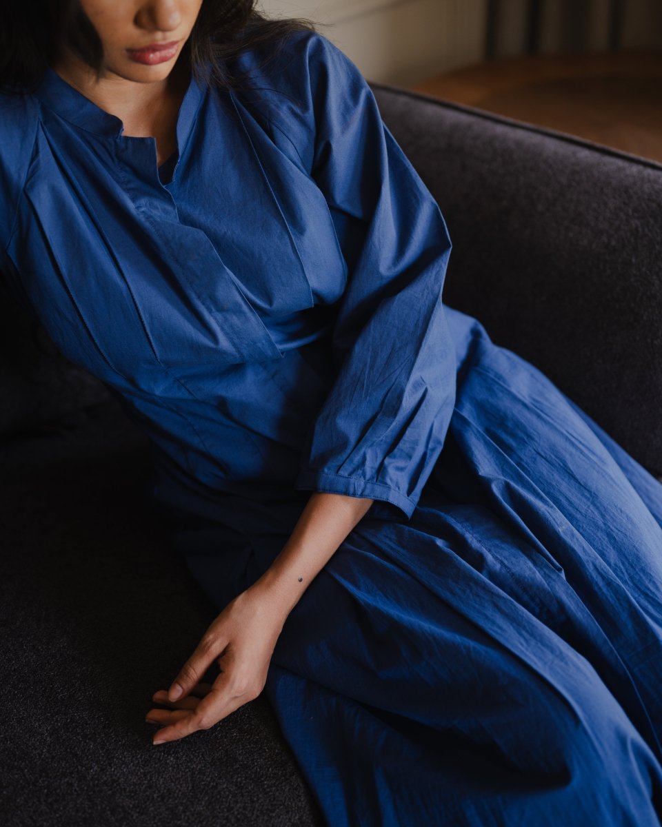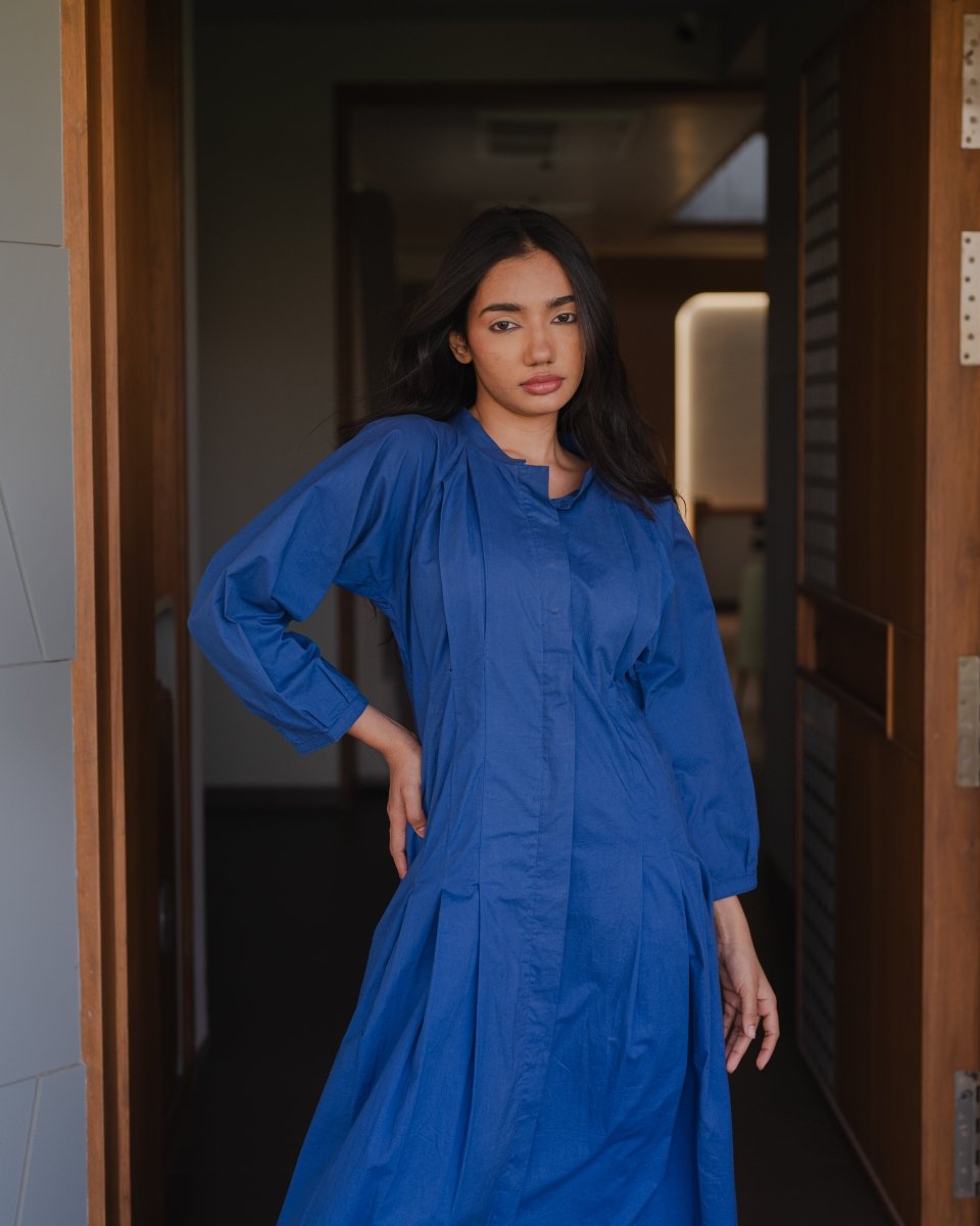 Made in organic cotton our downtown dress has mandarin collar and front buttonhole opening. The dress features full sleeves with gathers on the cuff line, pleat details on the waistline and pockets.