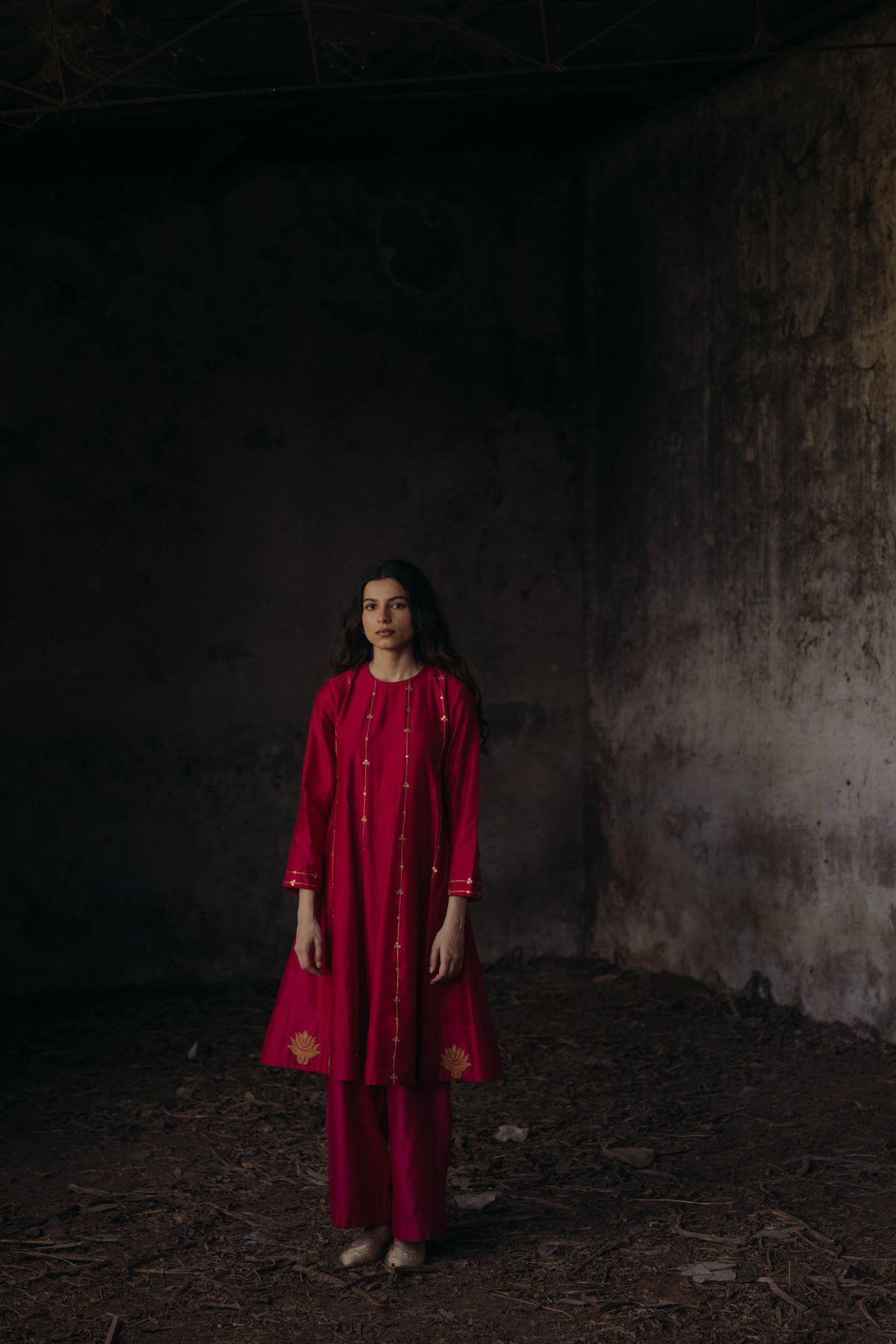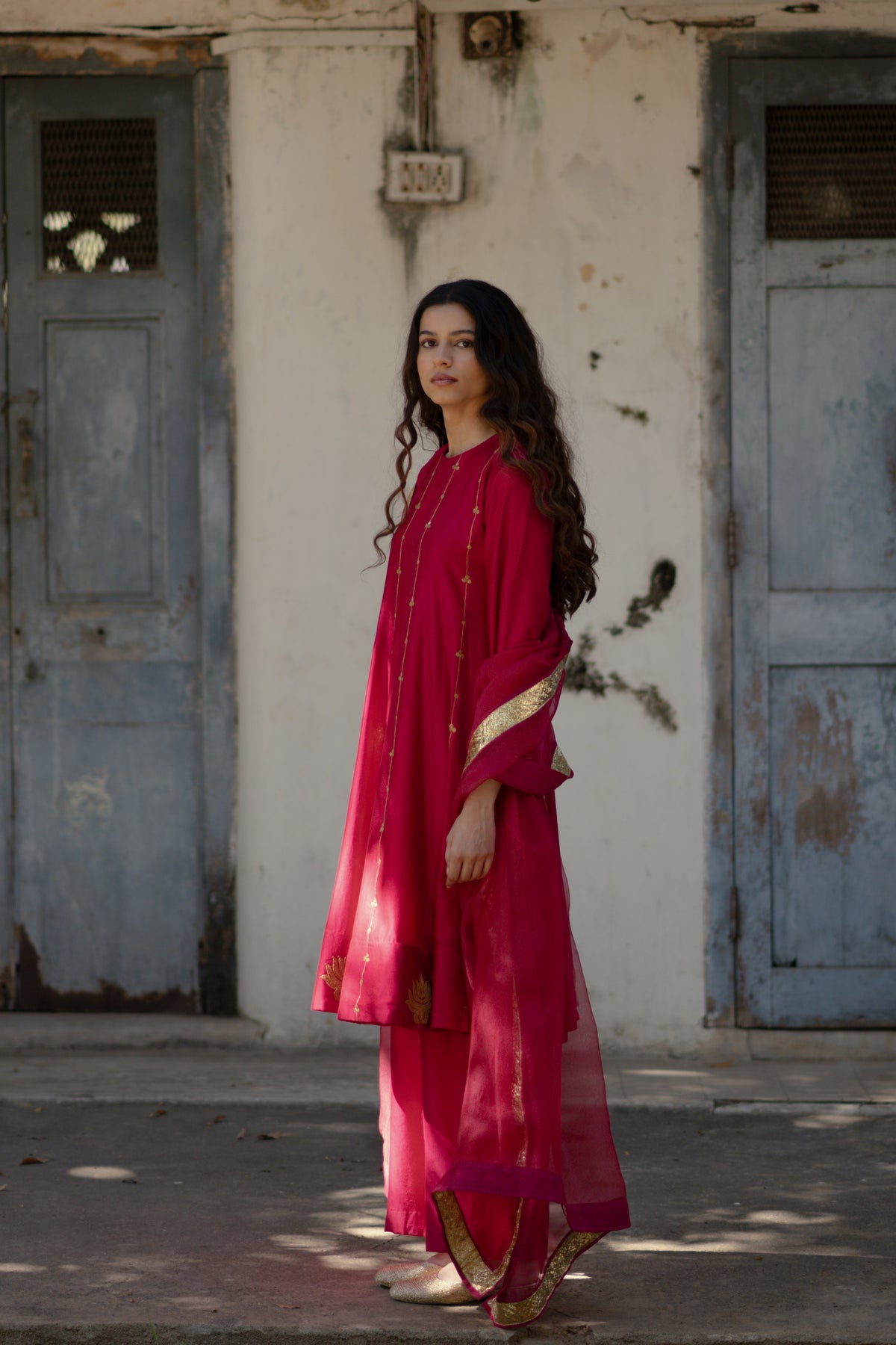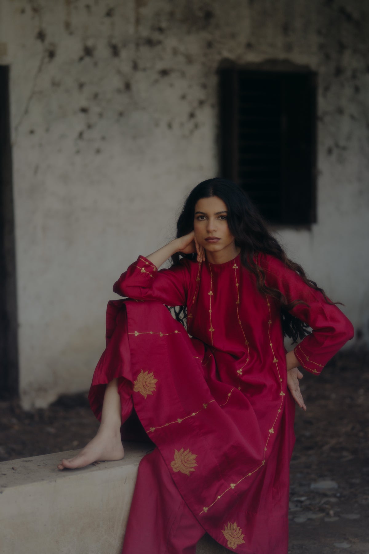 Nebula features a panelled kurta, trousers and dupatta. Kurta and trousers are made in handwoven chanderi silk. Kurta features parallel aari embroidery all-over and sleeves with lotus marodi motifs on the hemline. It has front round neck and back slit opening. Trousers are parallel fit with side pockets. Dupatta features a metal gota lace on the borders. It is made in handwoven organza silk.