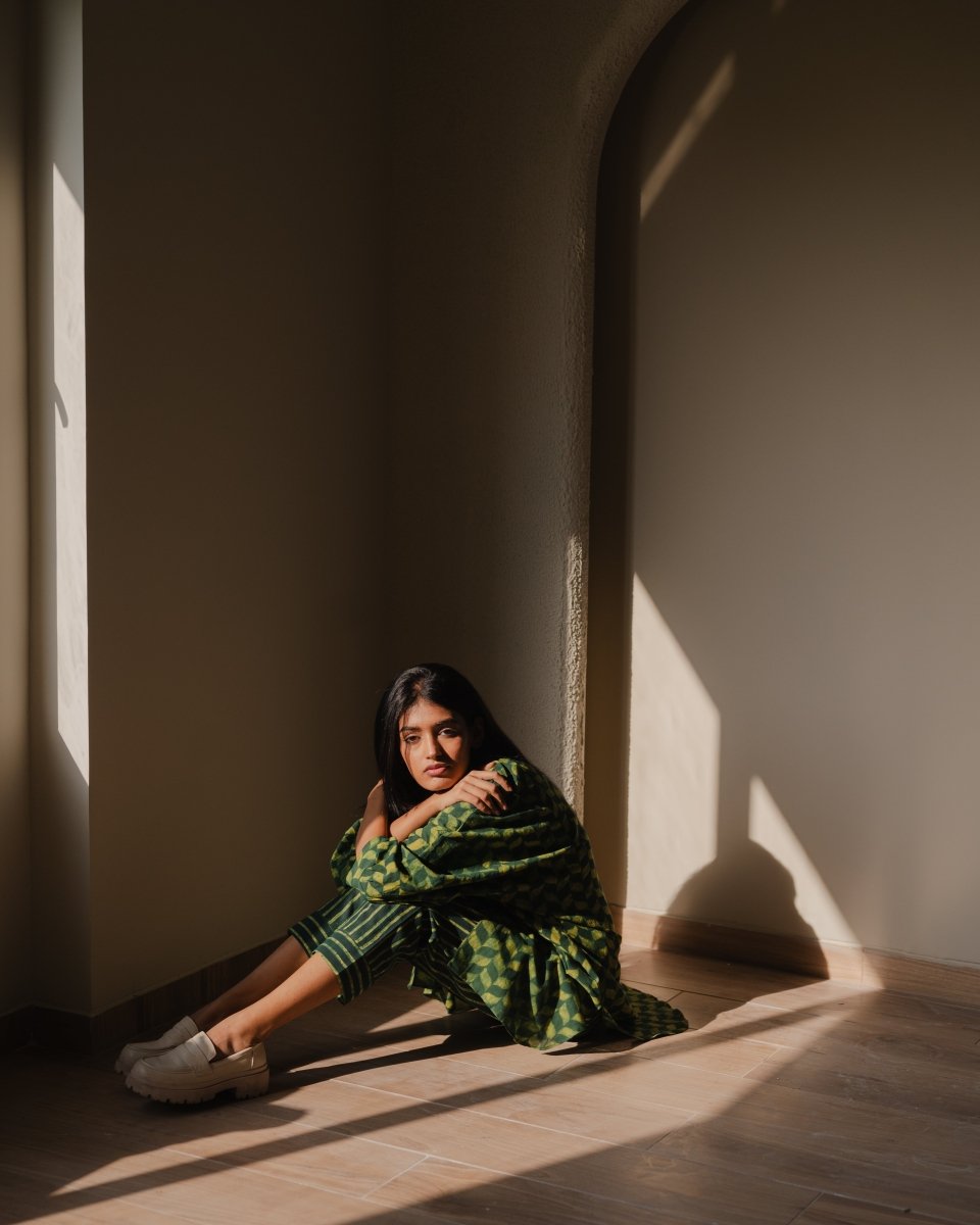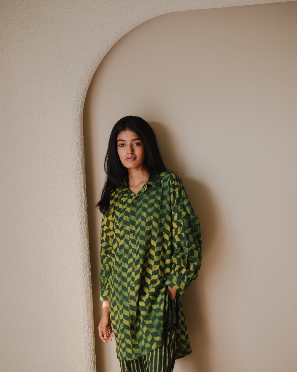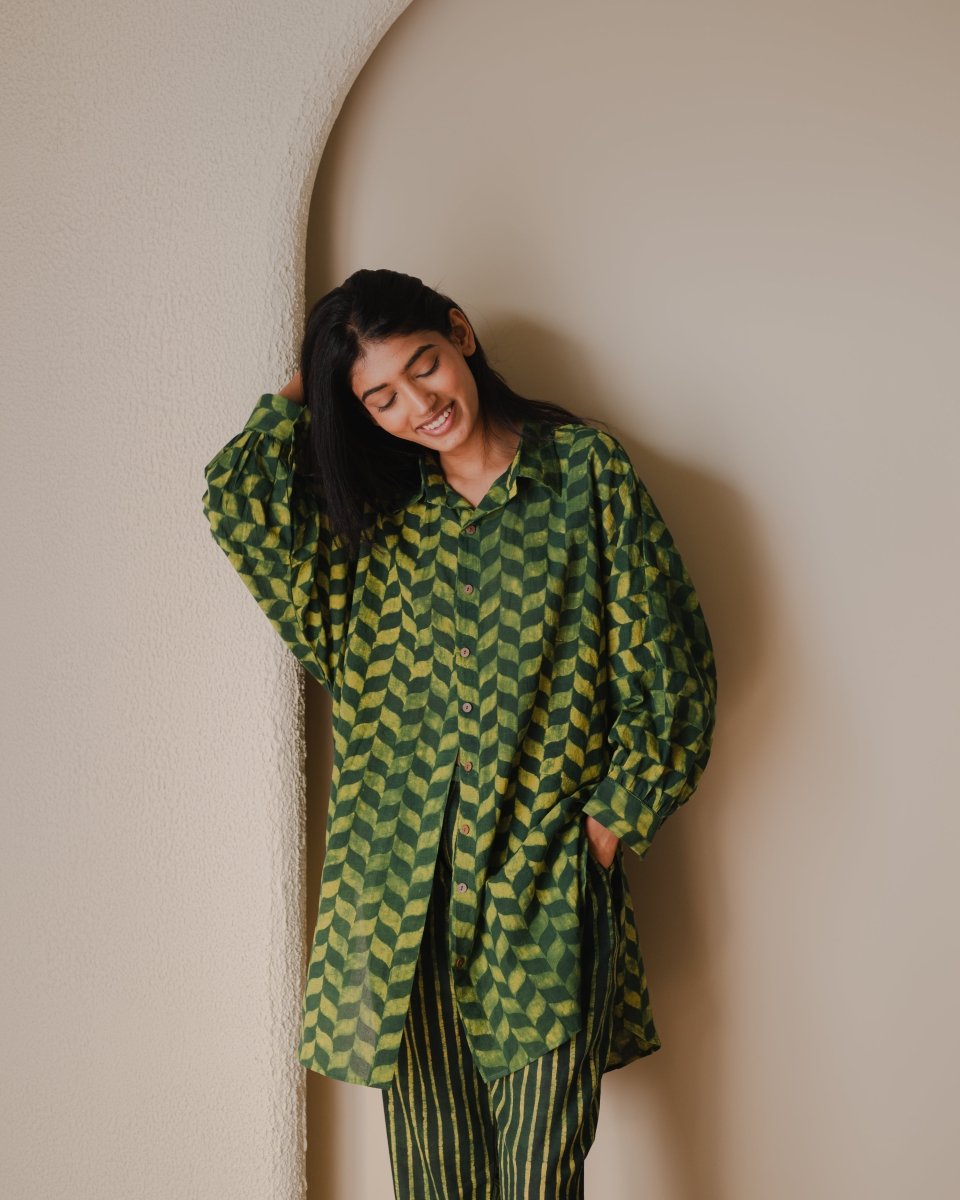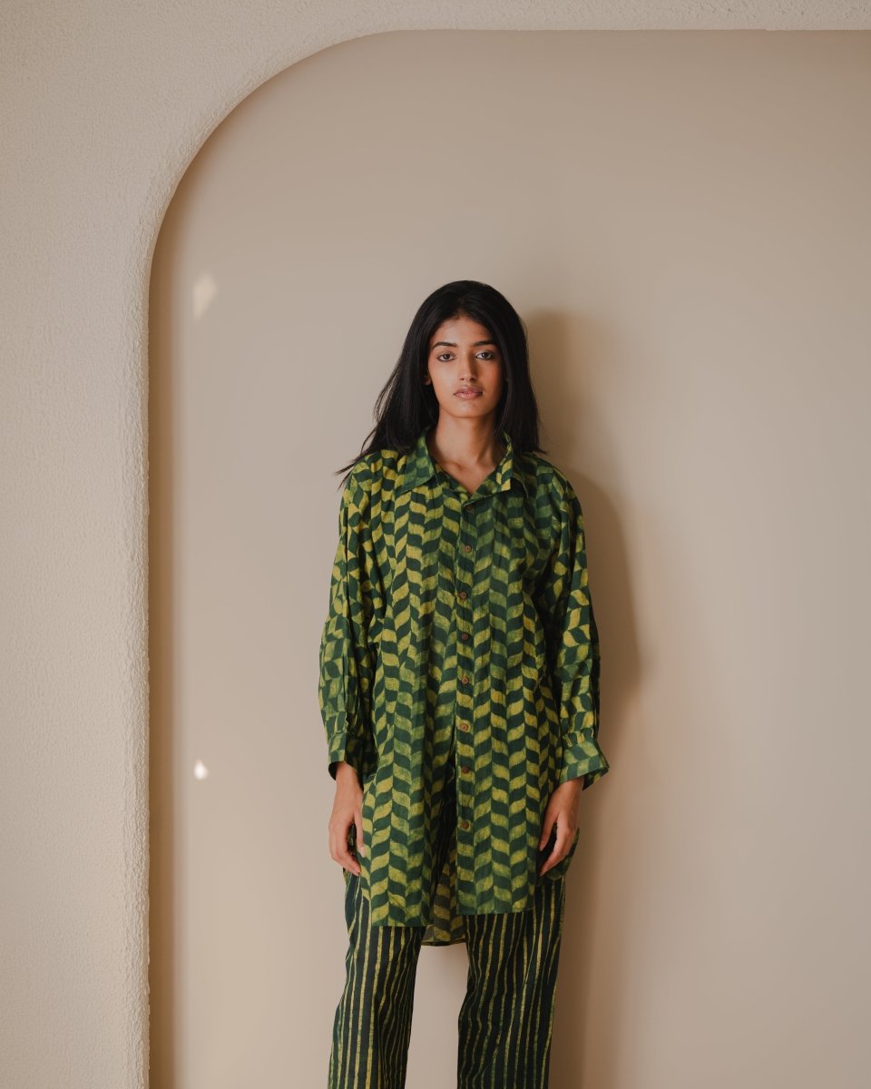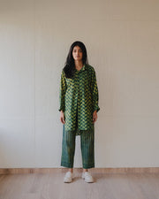 Orchard trousers and shirt set is made in hand-spun cotton and block printed in natural colours. Shirt comes with a free size silhouette, collar neckline, front button opening and features gathering of fabric on cuff line. Trousers are straight fit and comes with pockets.