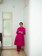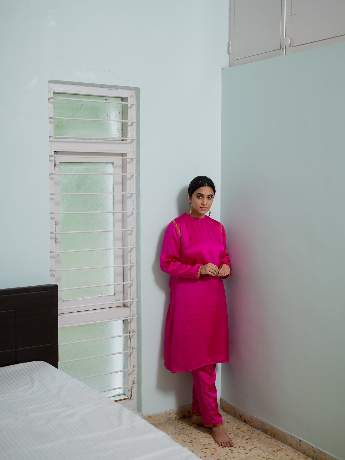 Seen here is Saher rani pink kurta and trousers made in satin silk. It has intricately hand embroidered marodi details on armhole and hem of trousers and sleeves. Kurta has a closed round neckline with back loop opening.