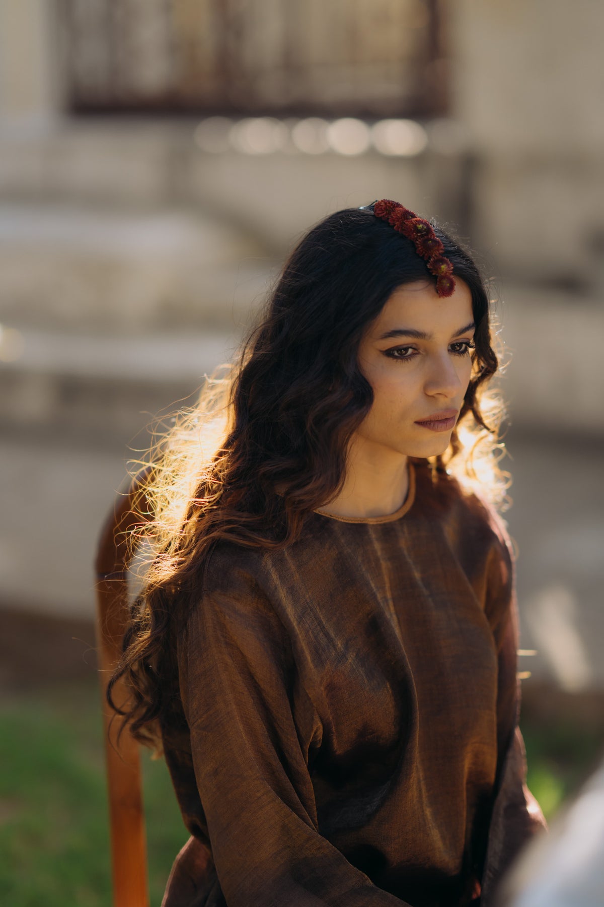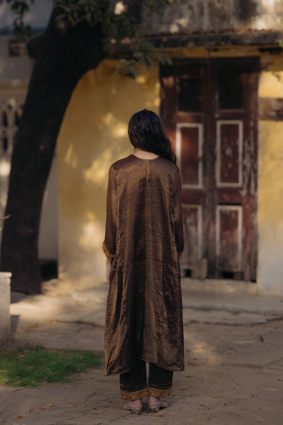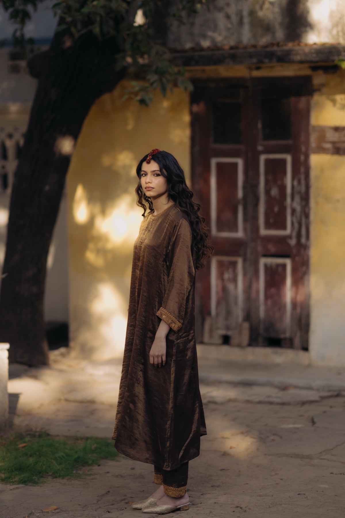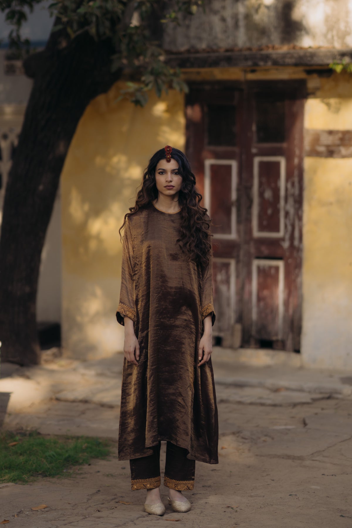 Virgo features a panelled kurta and trousers made in handwoven zari silk. The kurta has a round neckline with back slit opening, side pockets and marodi embroidery on the sleeves hem and neck. Trousers are a straight fit with pockets and embroidery on the hemline.