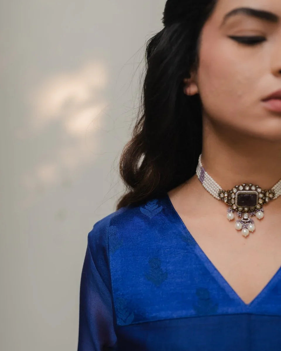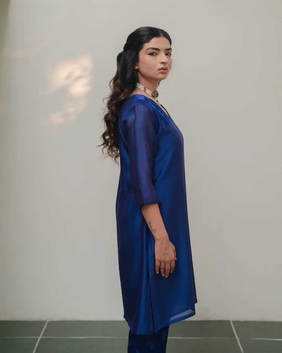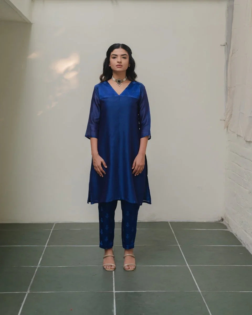 Yama short kurta made in chanderi silk with V neckline is paired with self embroidered gajji silk tousers. Kurta has patch of gajji on the neckline.